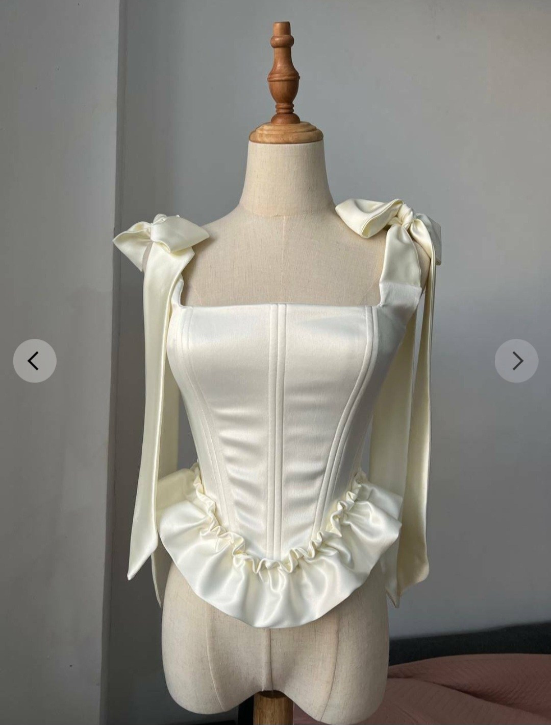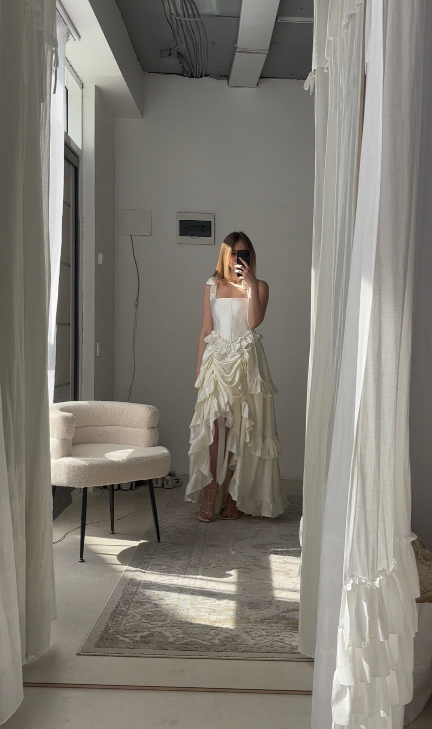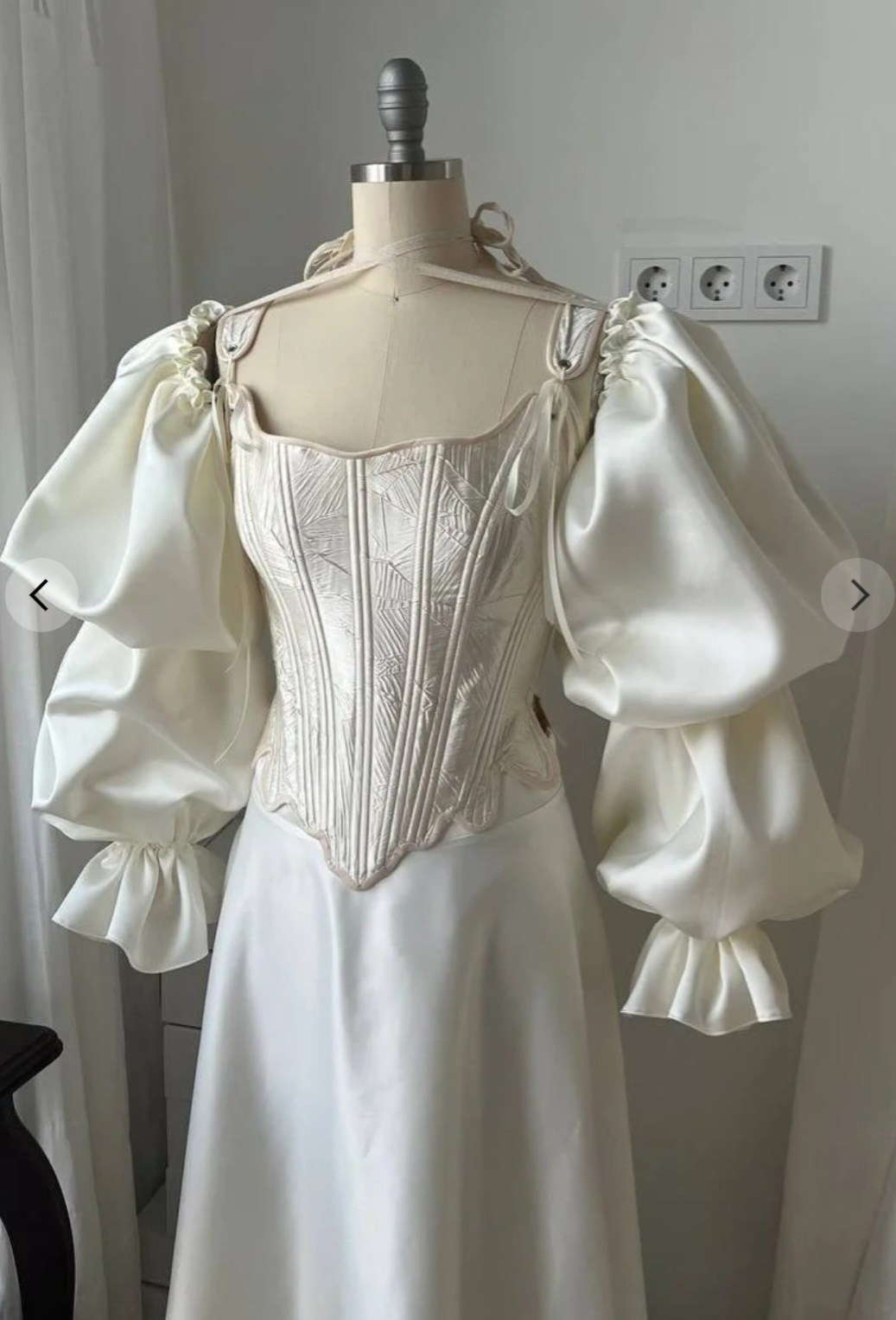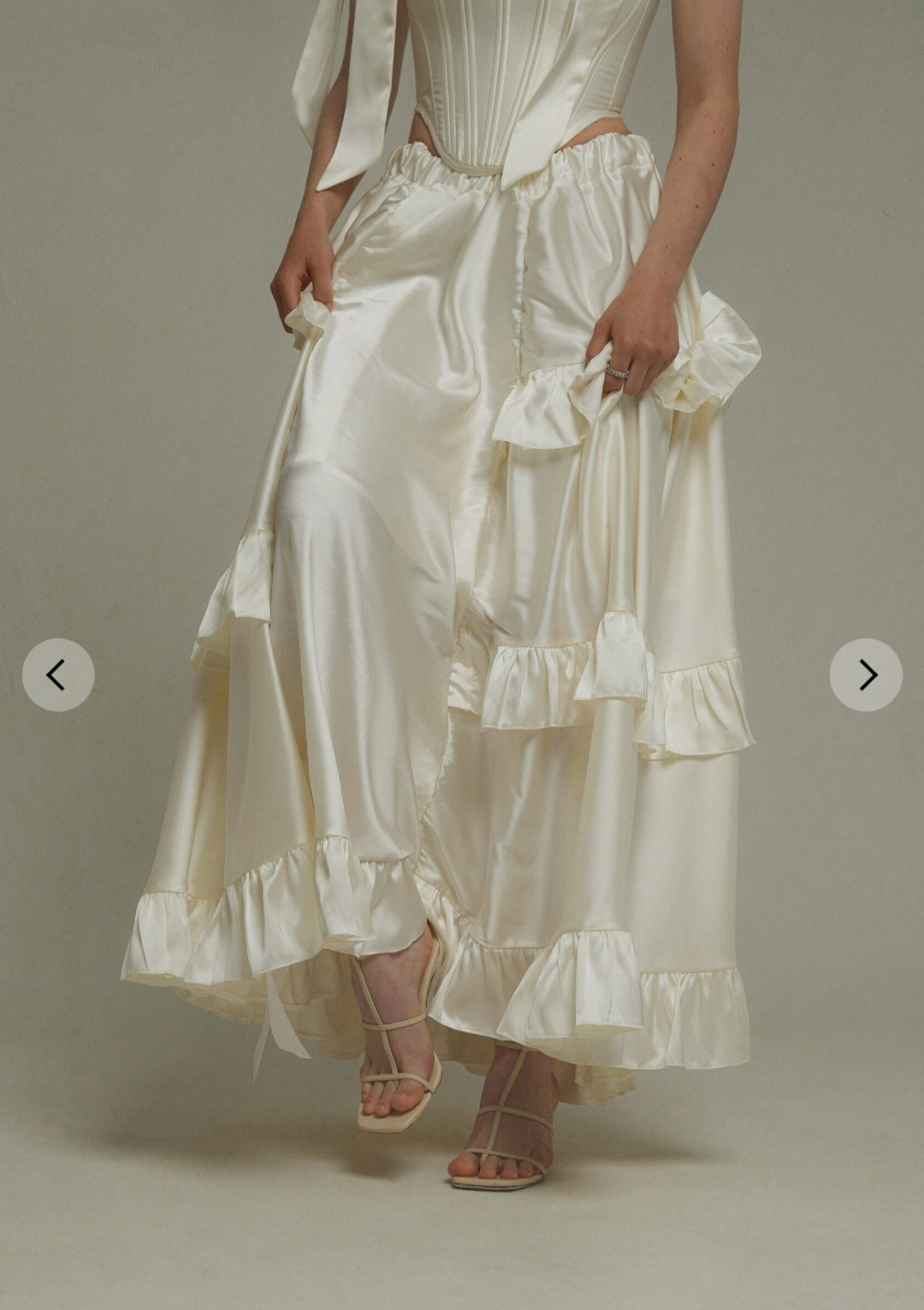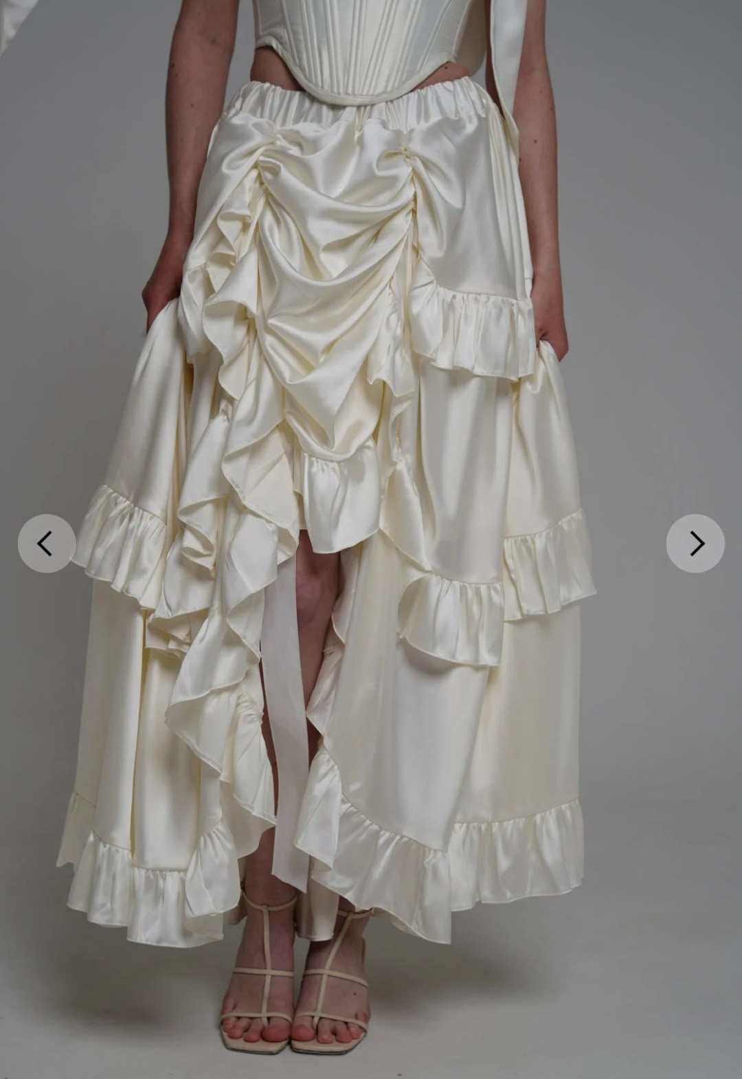 Комплект «тройка»: атласная юбка на резинке + корсет из шелка + съёмные воздушные рукава. Длина юбки спереди регулируется. В нашей коллекции корсет, который на первых фото. Не просвечивает, однако под юбку надевайте только бежевое/телесное нижнее белье. В наличии один комплект.