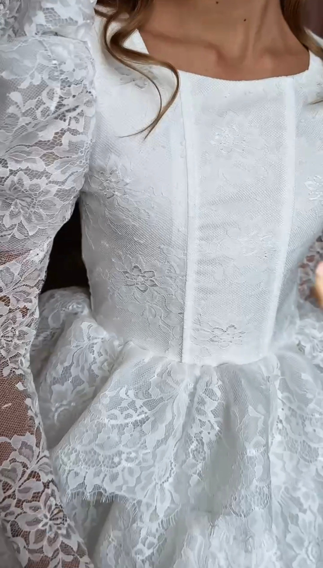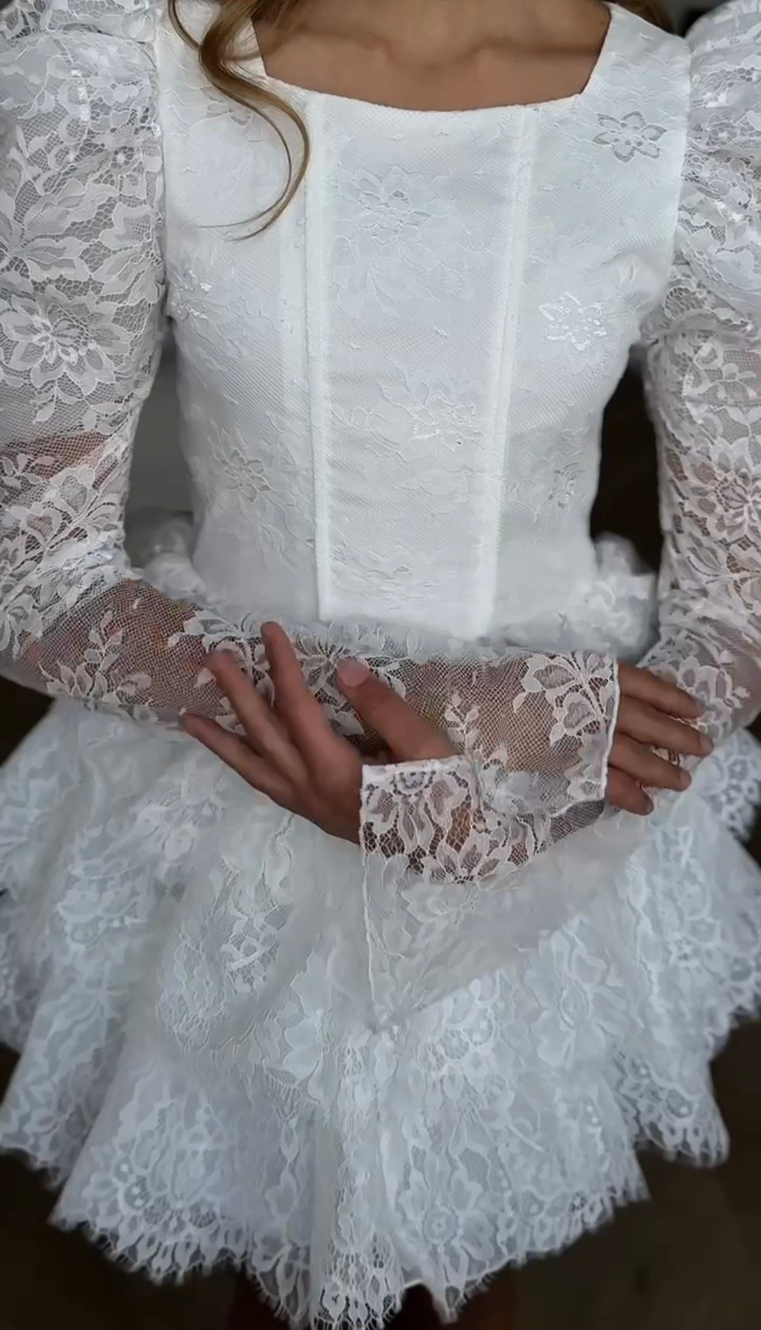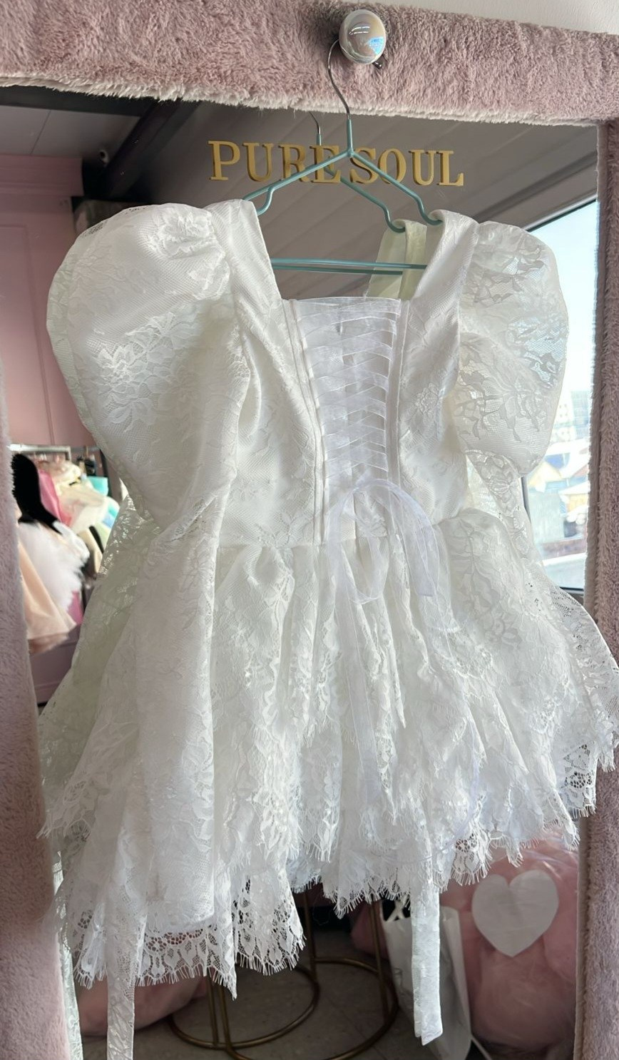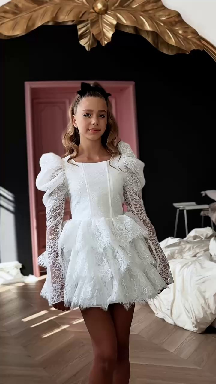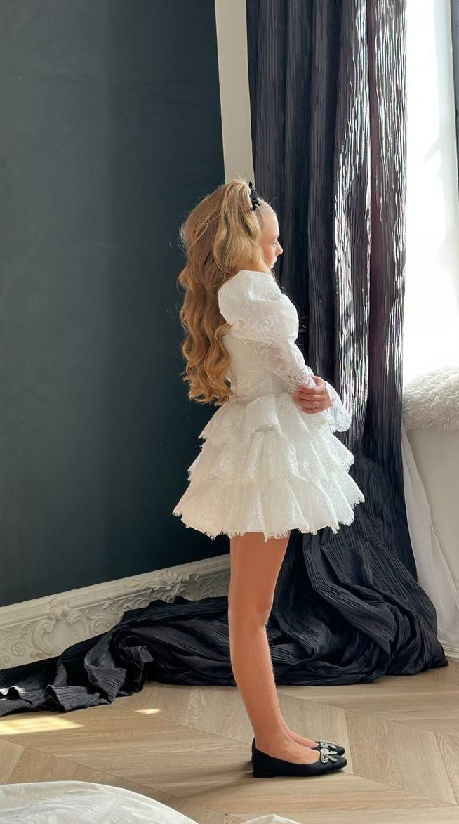Укороченное платье из кружева с объемными рукавами, на спине шнуровка, а на талии завязывающийся пояс для регулировки посадки платья. В наличии 3 платья.