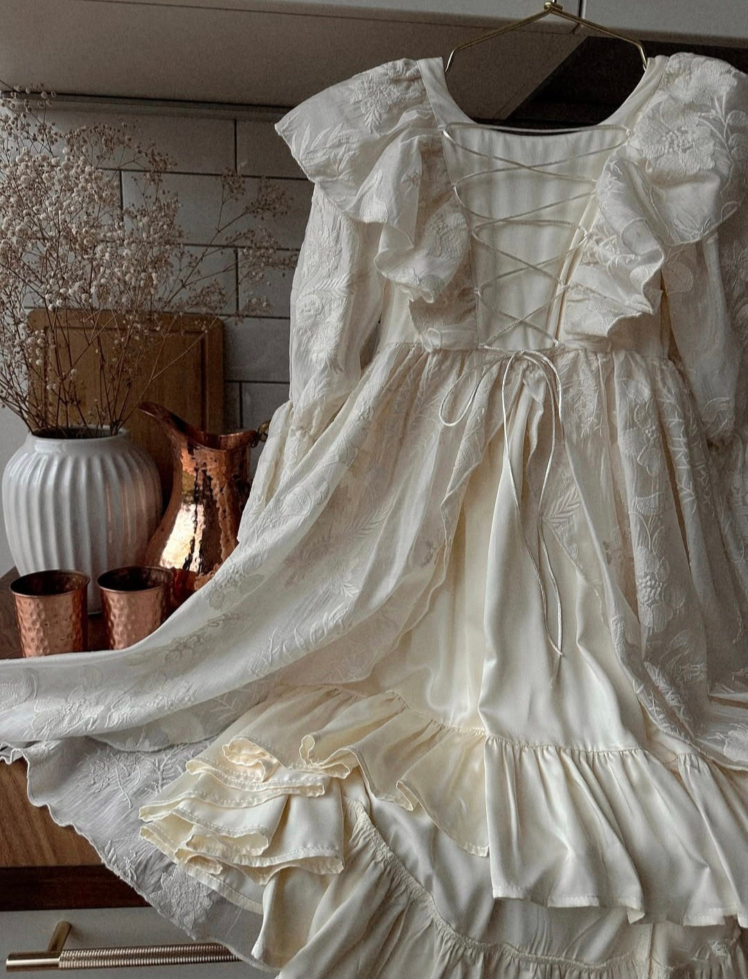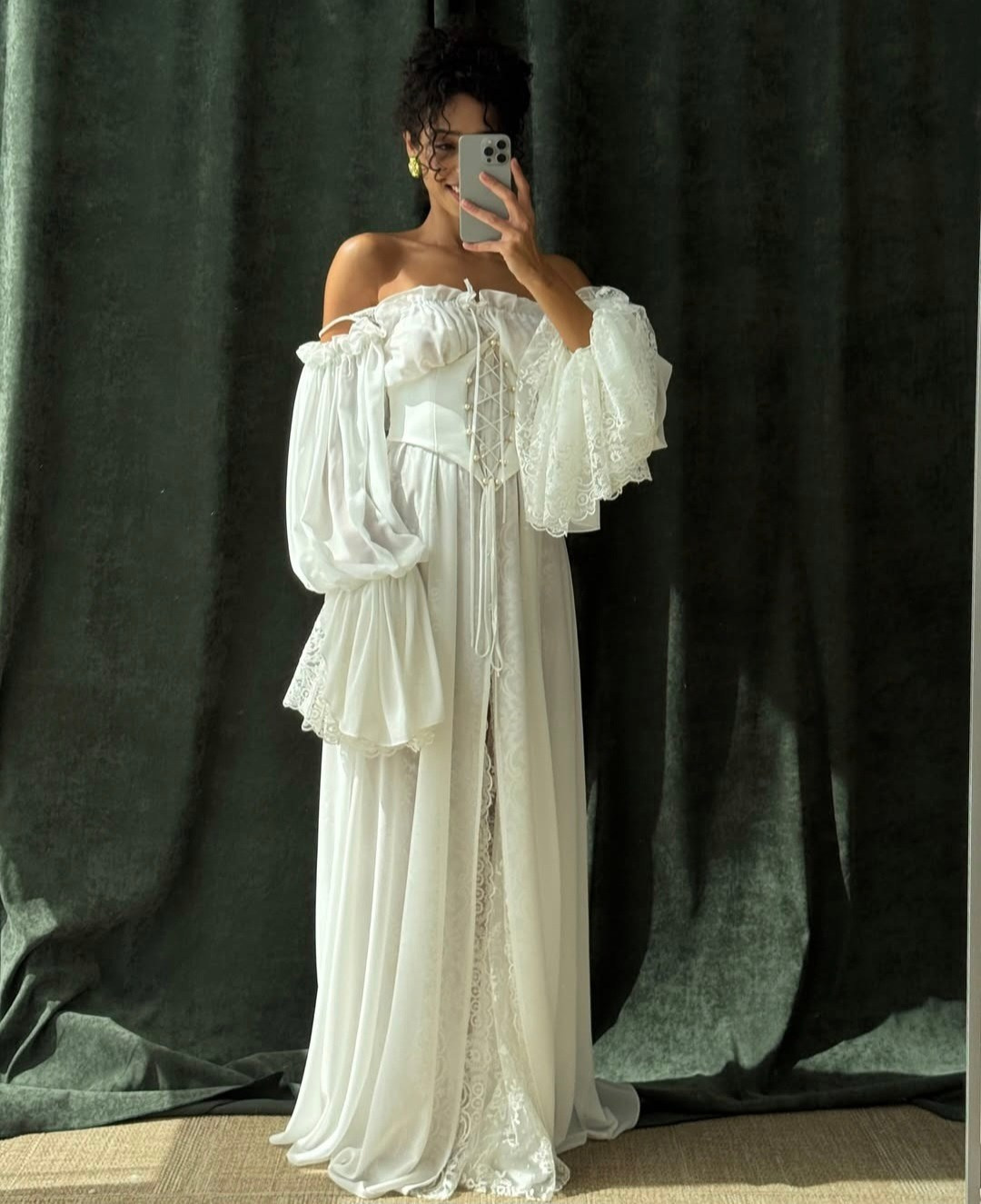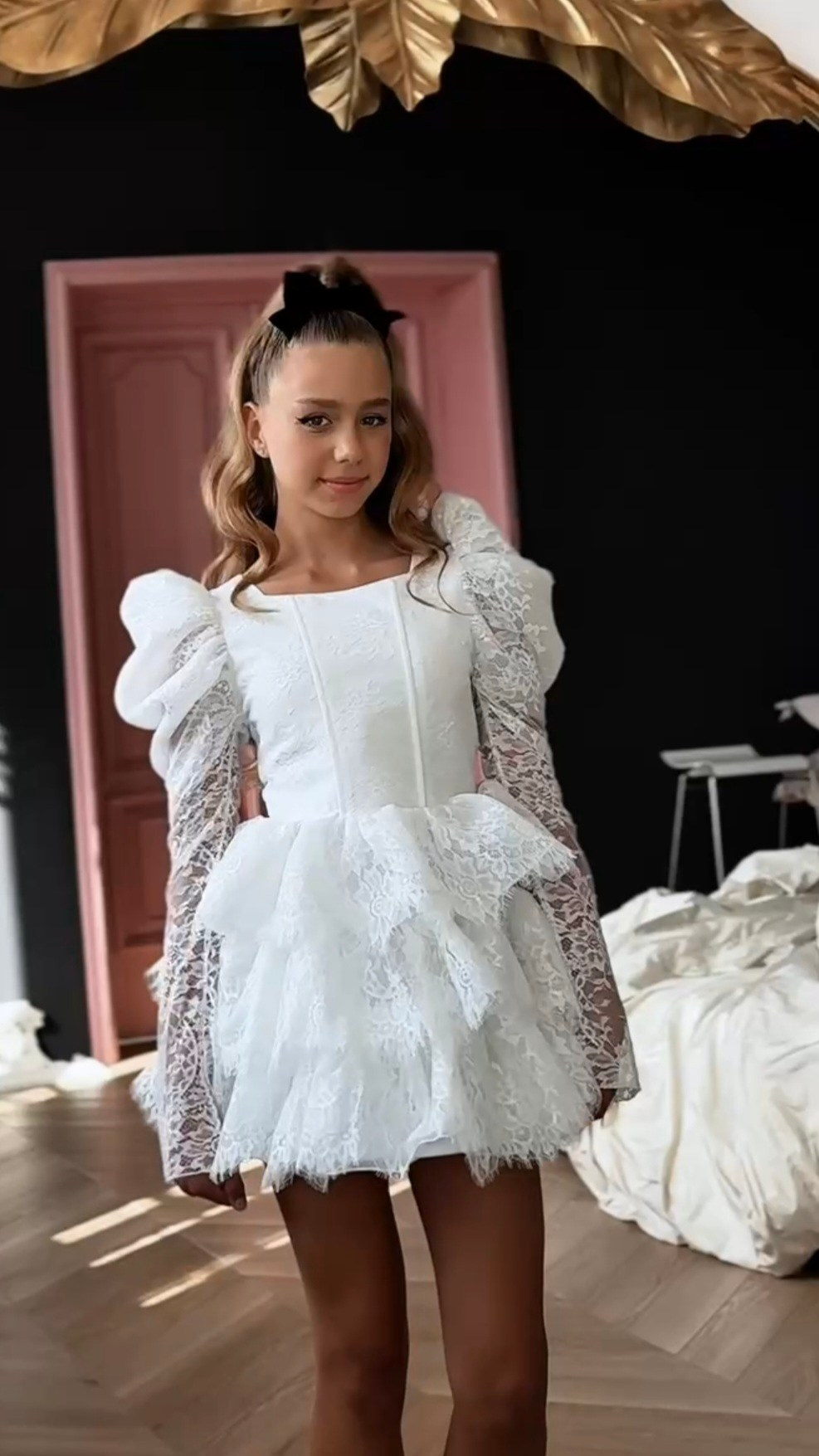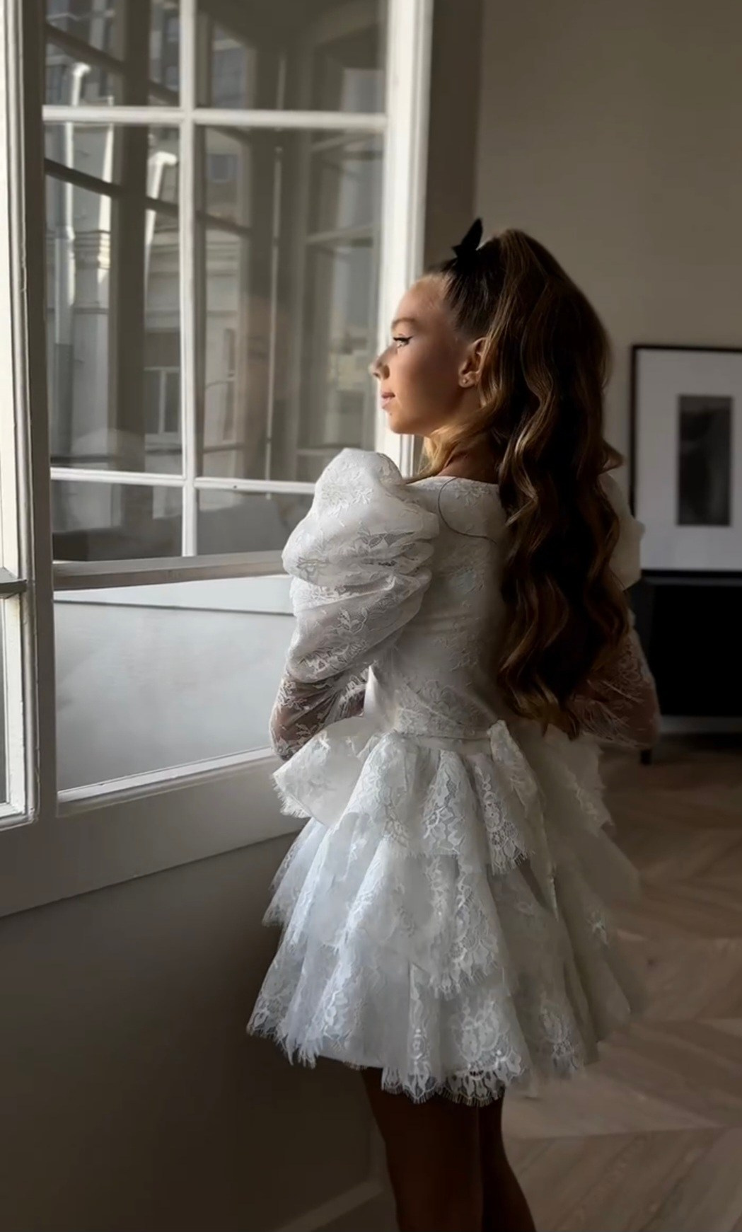 Укороченное платье из кружева с объемными рукавами, на спине шнуровка, а на талии завязывающийся пояс для регулировки посадки платья. В наличии 3 платья.