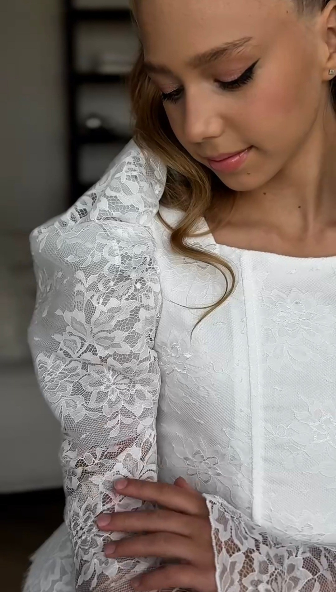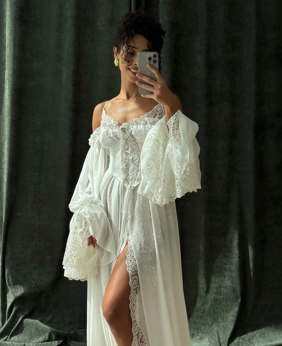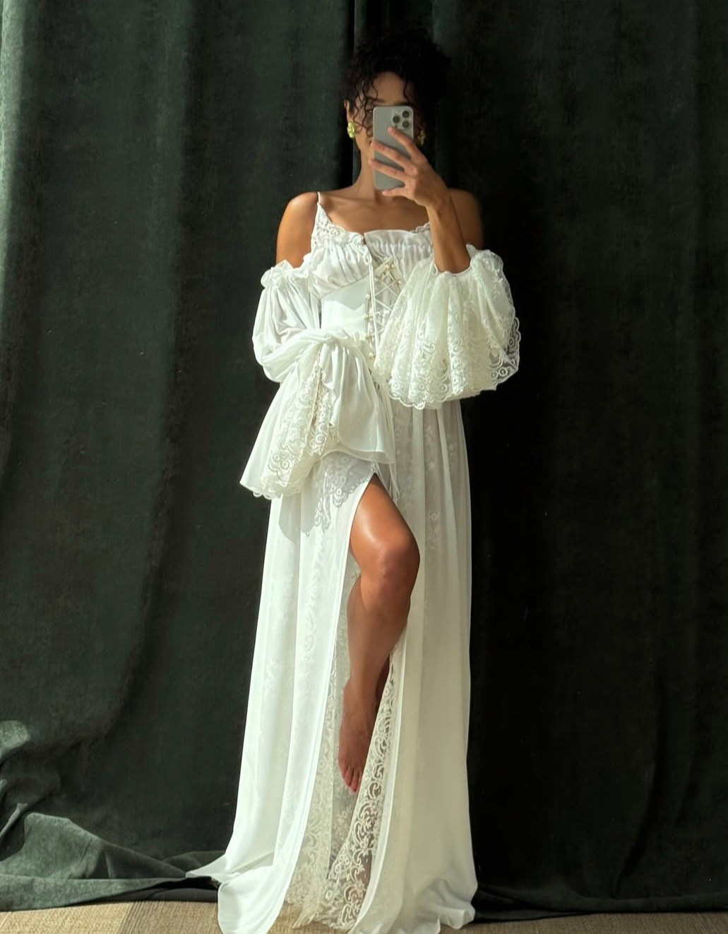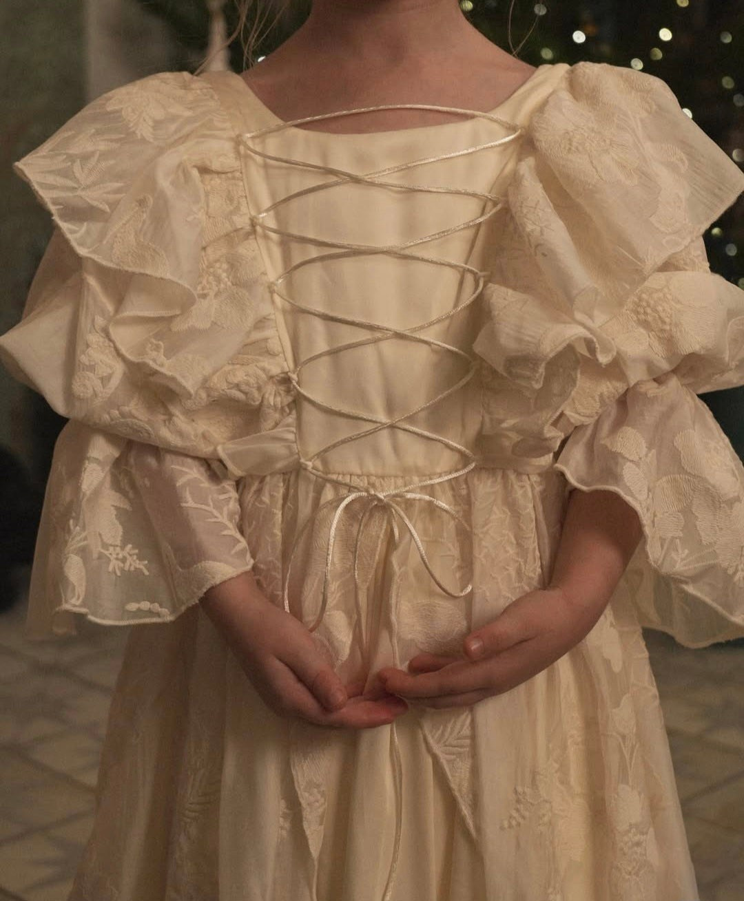 Укороченное платье из кружева с объемными рукавами, на спине шнуровка, а на талии завязывающийся пояс для регулировки посадки платья. В наличии 3 платья.