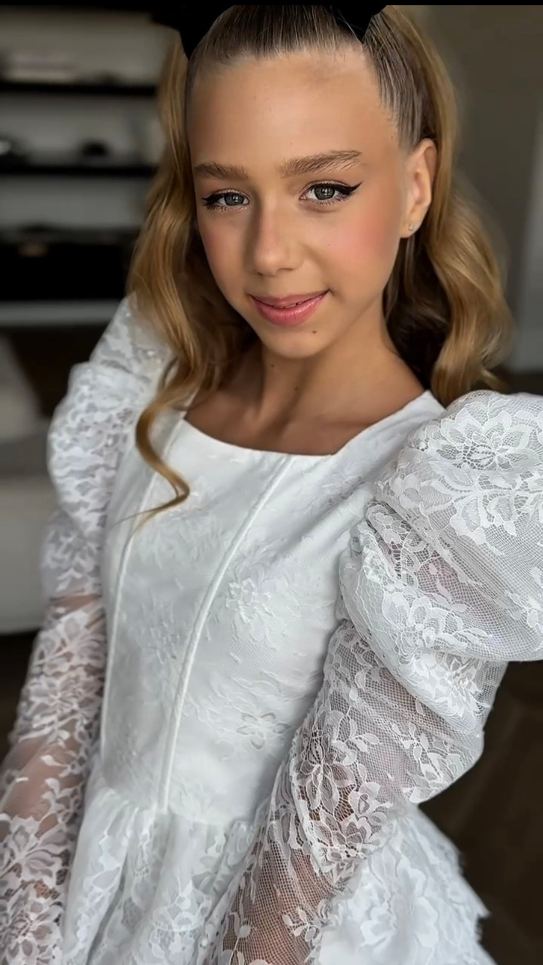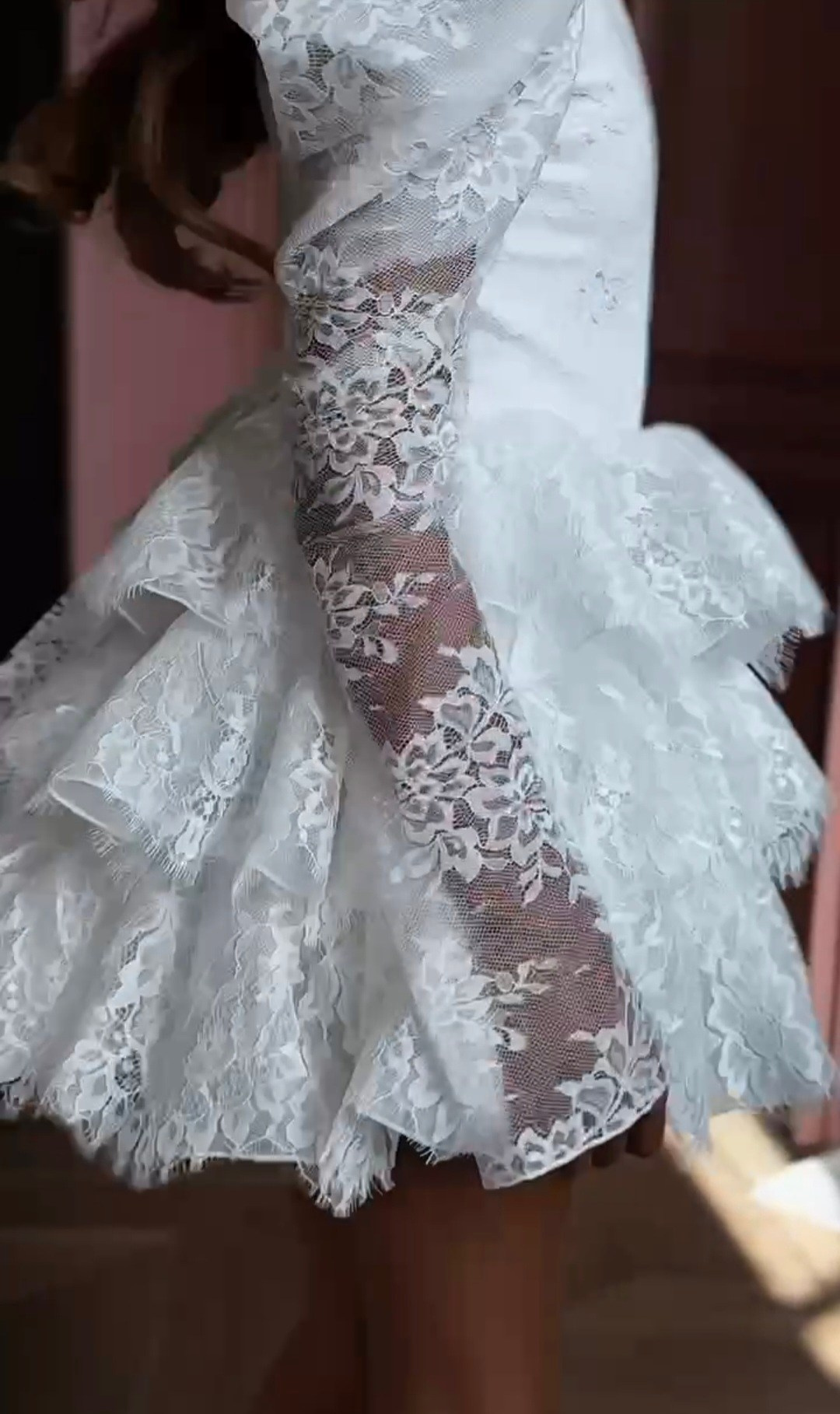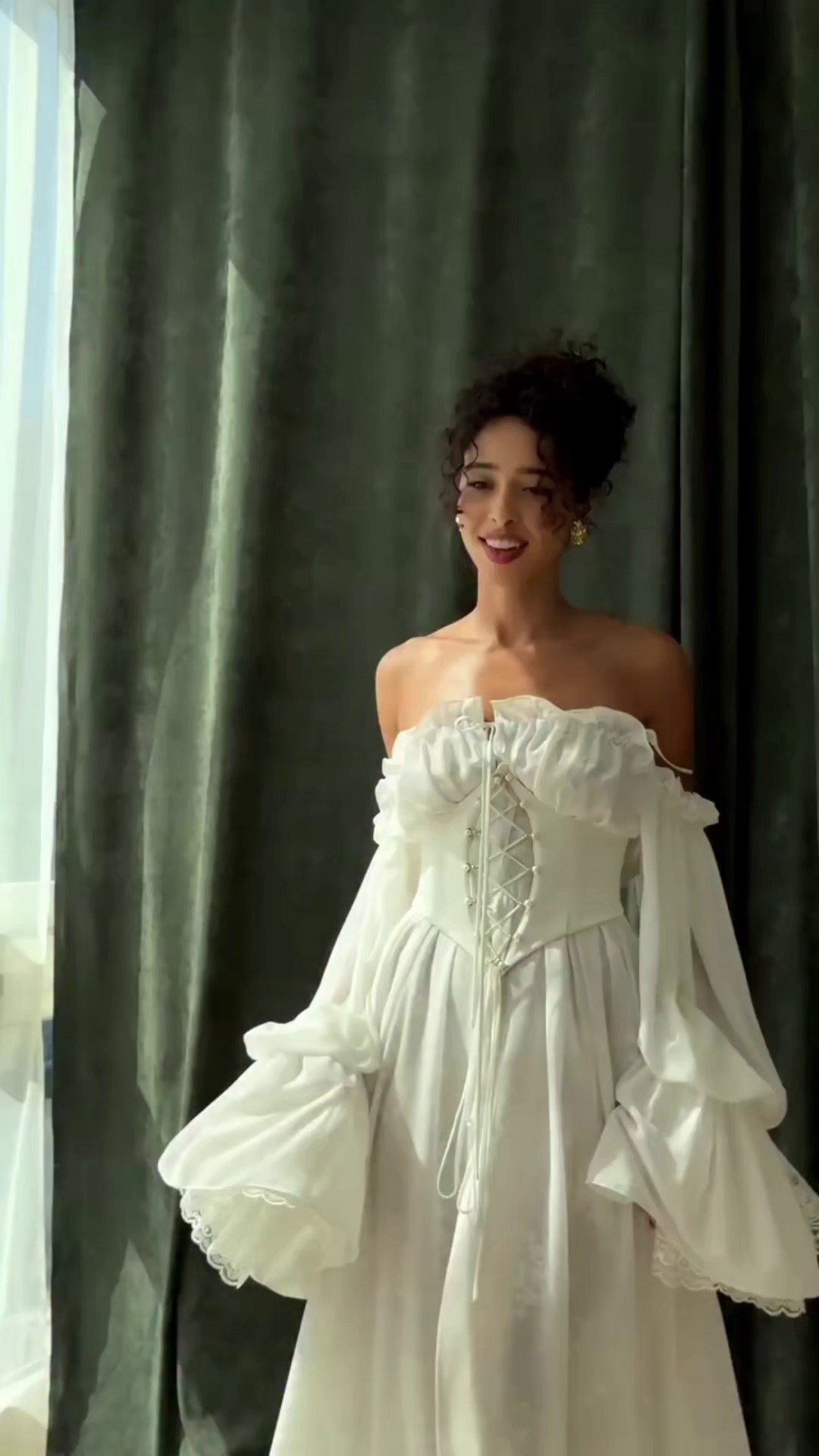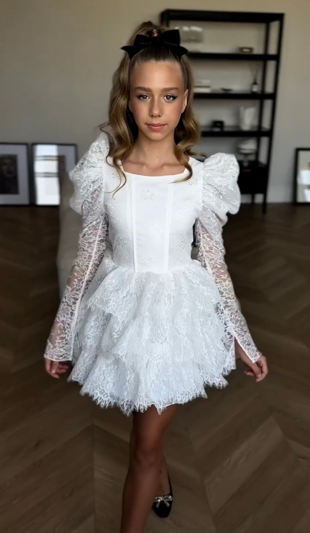 Укороченное платье из кружева с объемными рукавами, на спине шнуровка, а на талии завязывающийся пояс для регулировки посадки платья. В наличии 3 платья.