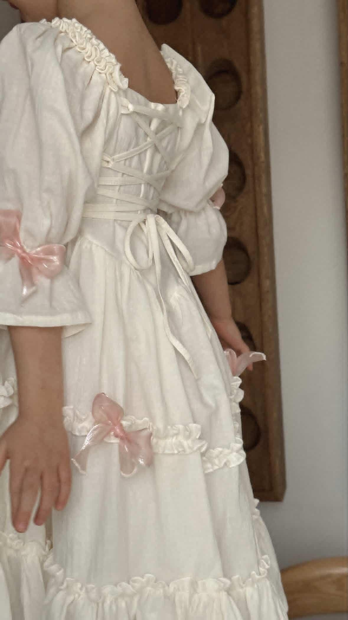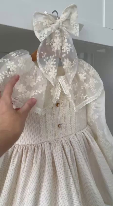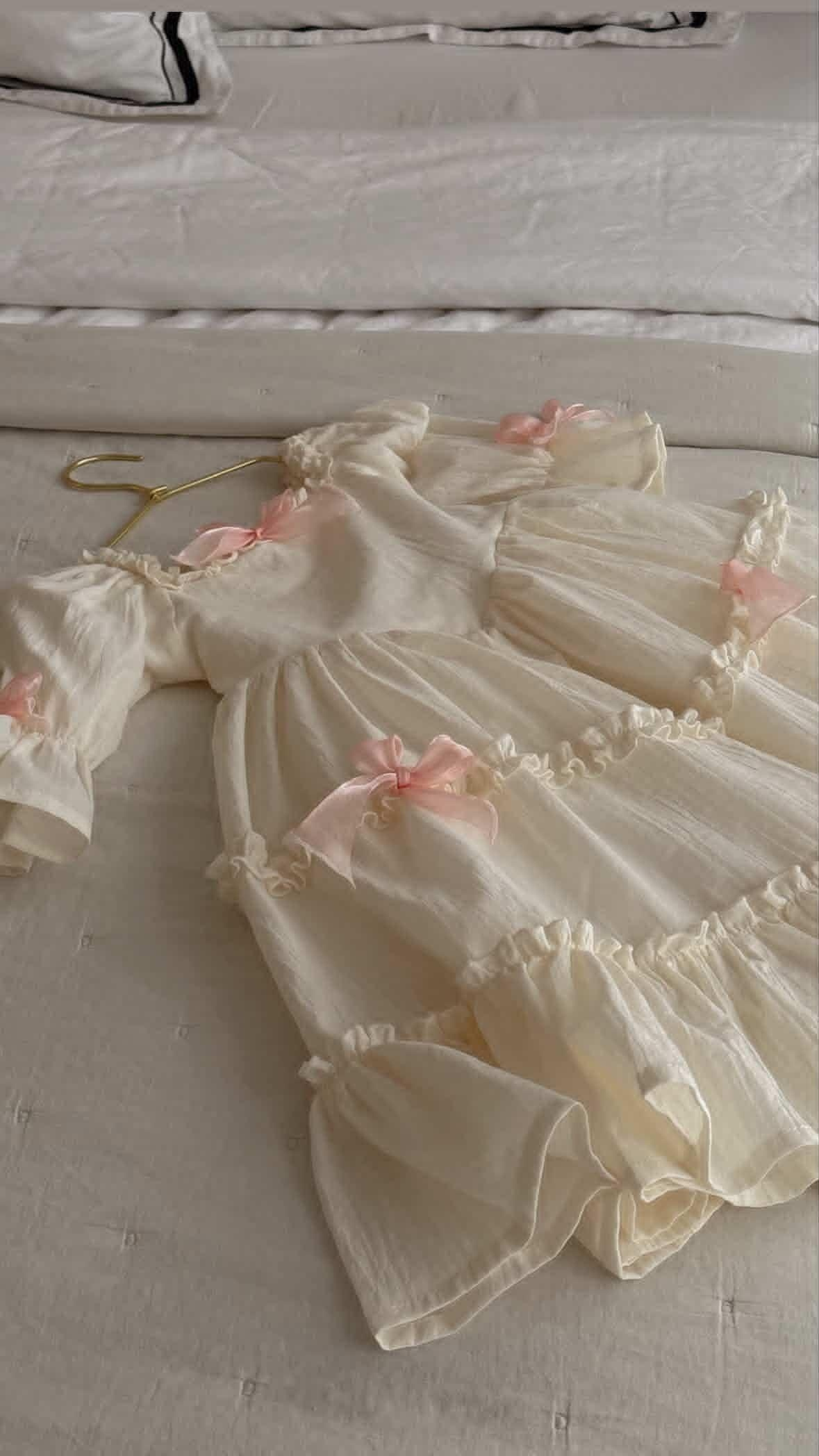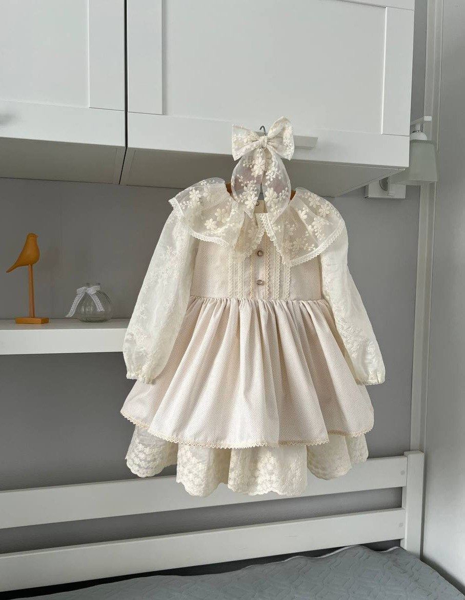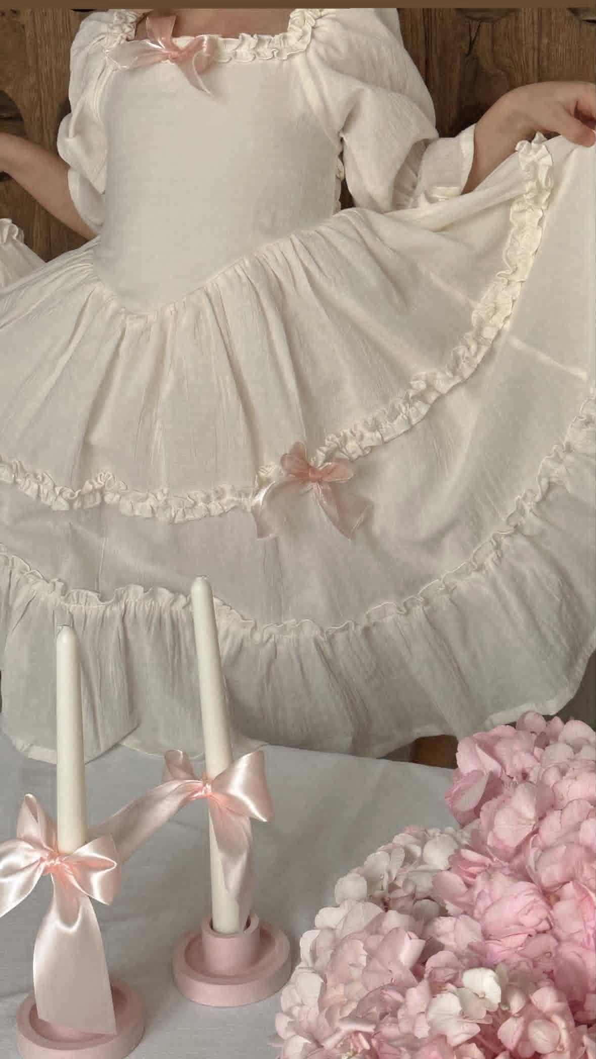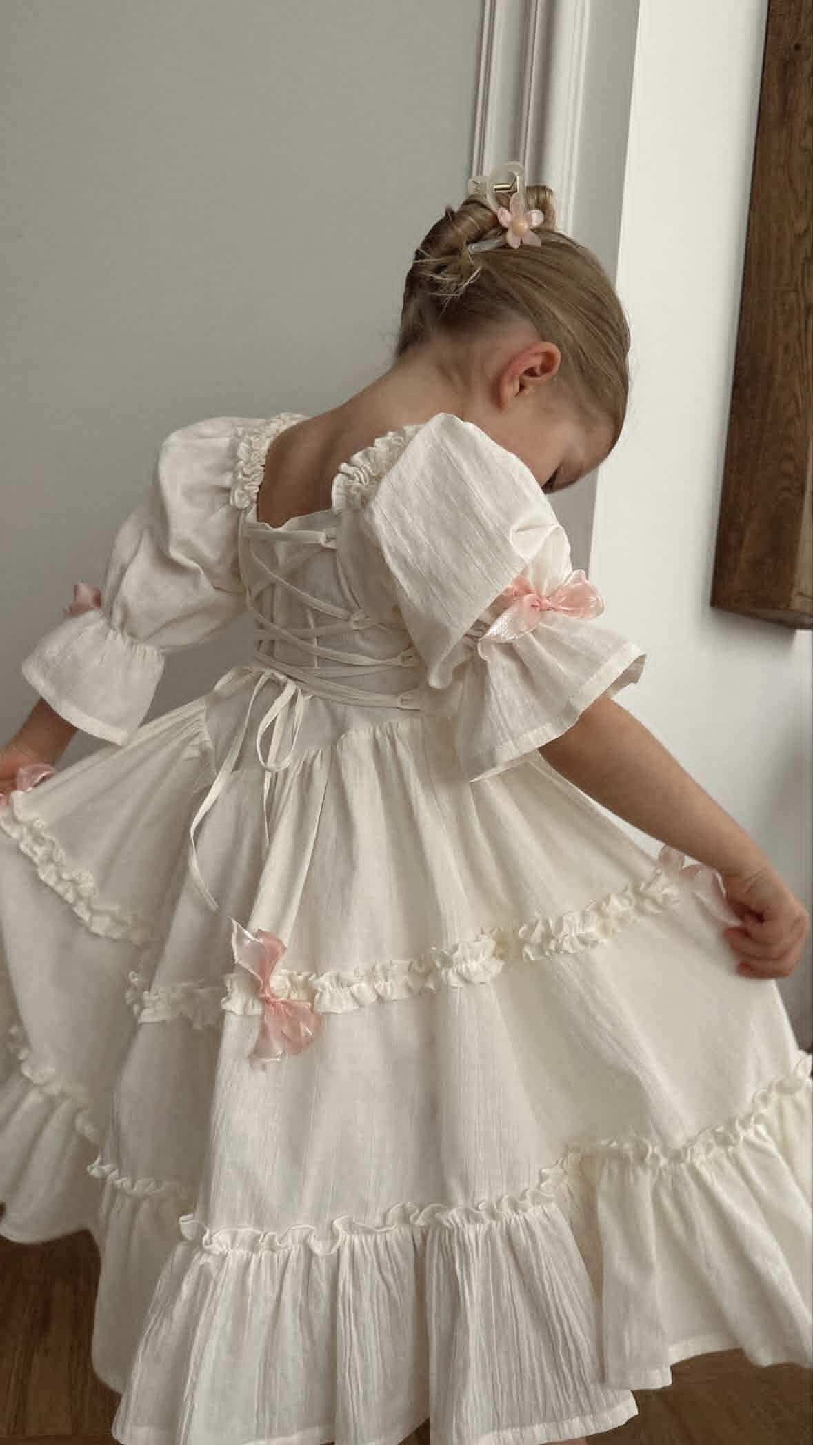 Платье выполнено из тонкого 100% хлопка крэш с подкладом. На спинке есть регулируемая шнуровка. Легкое, как взбитые сливки, нежные, как лепестки роз, и бантики — как глазурь на любимом пирожном. Розовые заколки с длинными лентами и бант в комплекте. В наличии 2 платья.