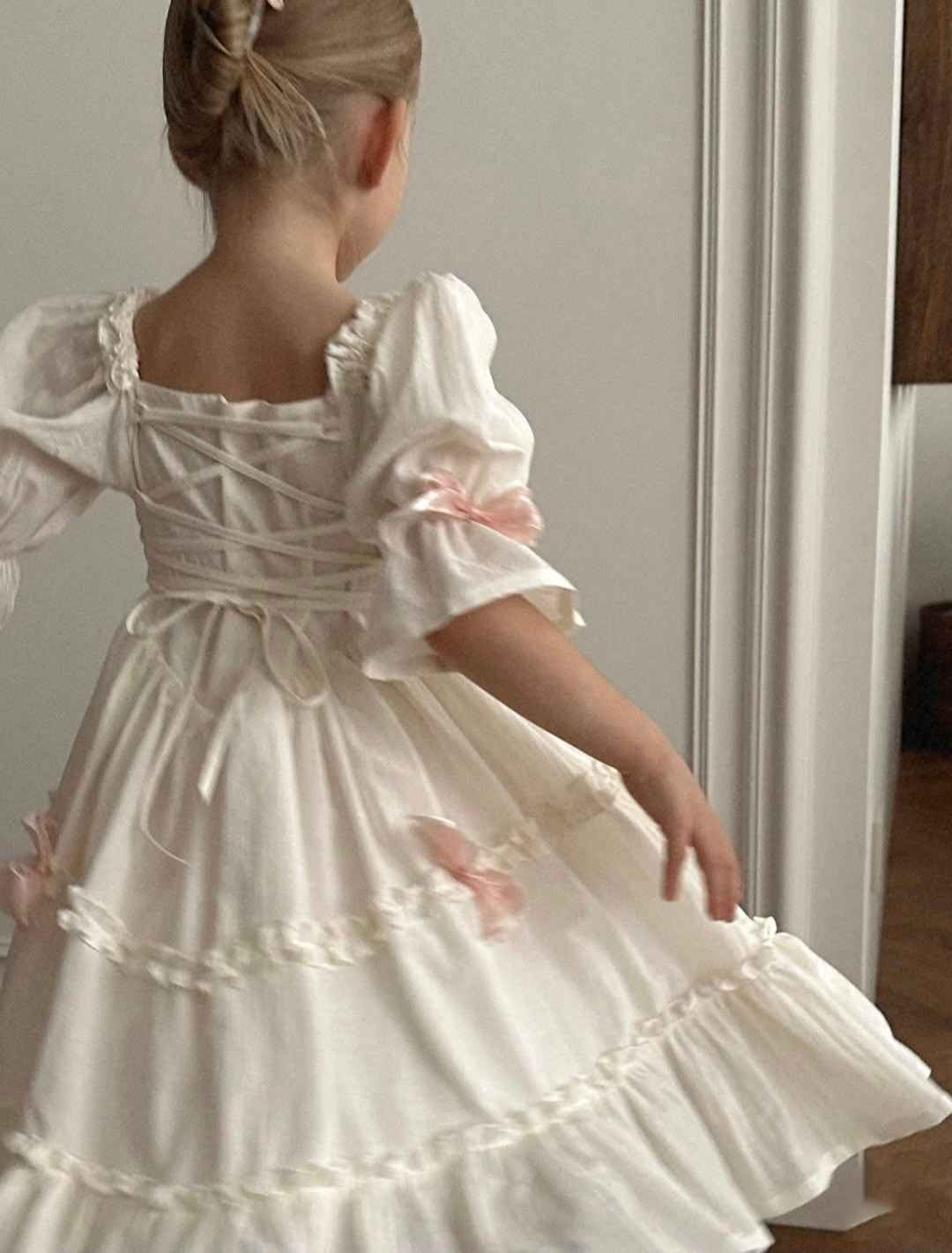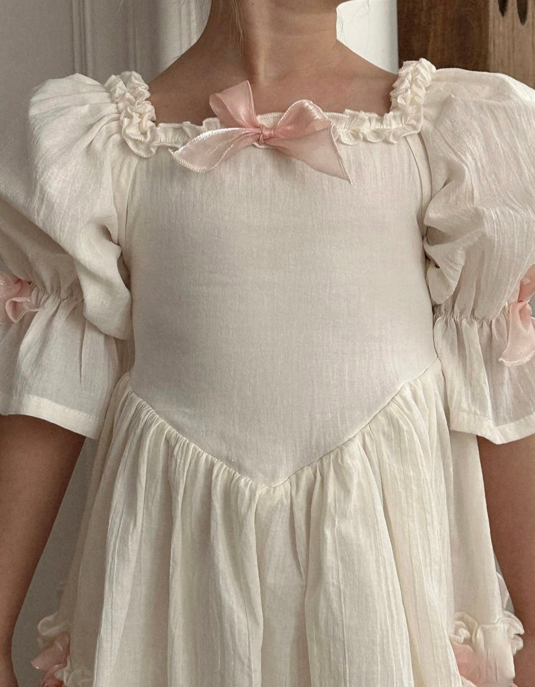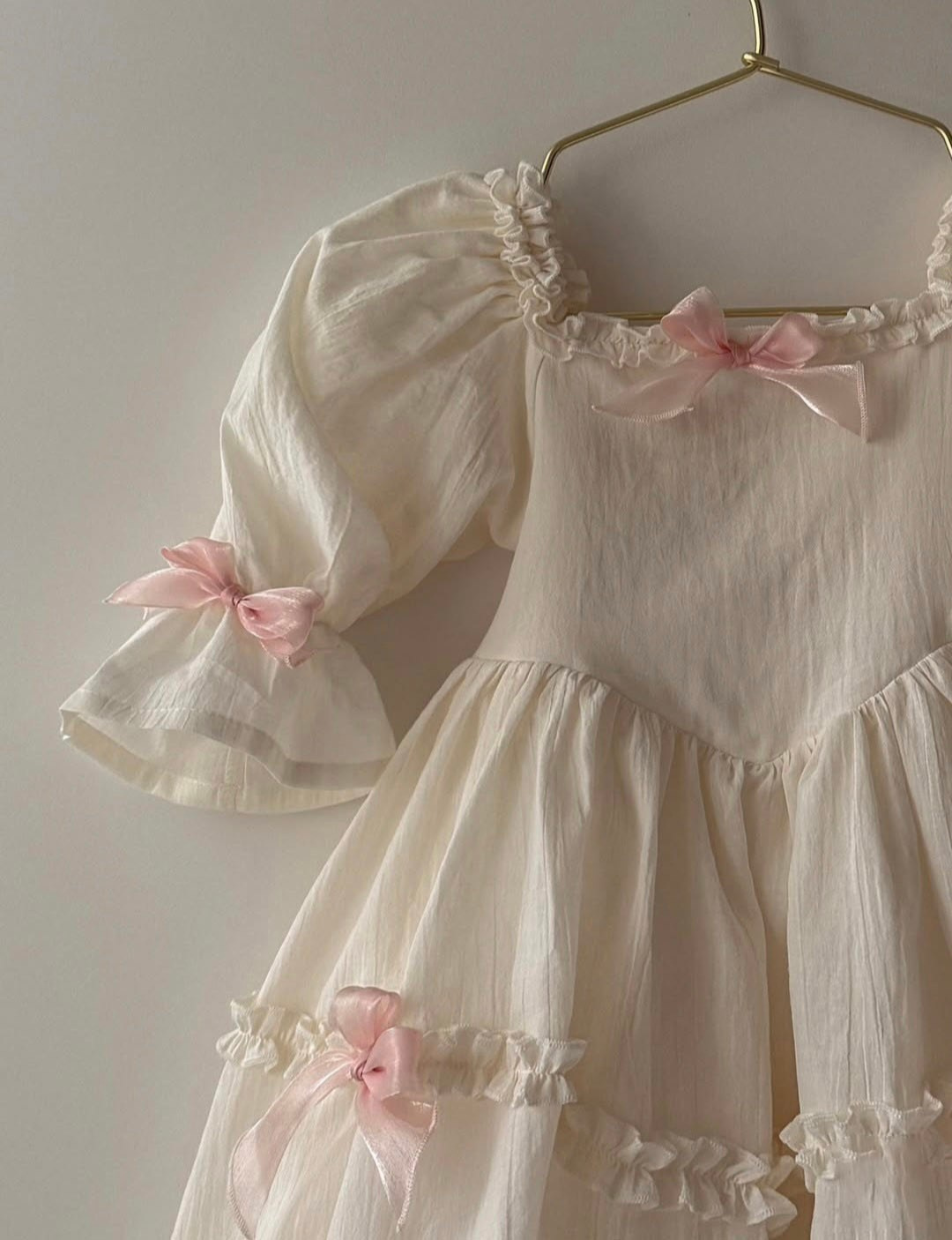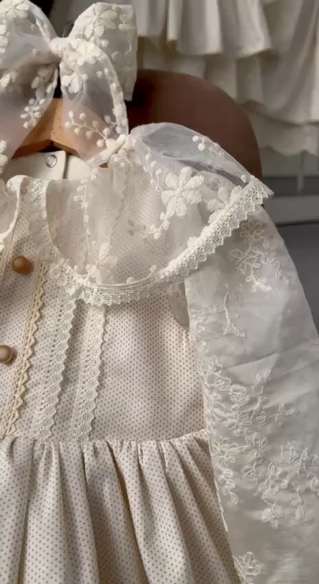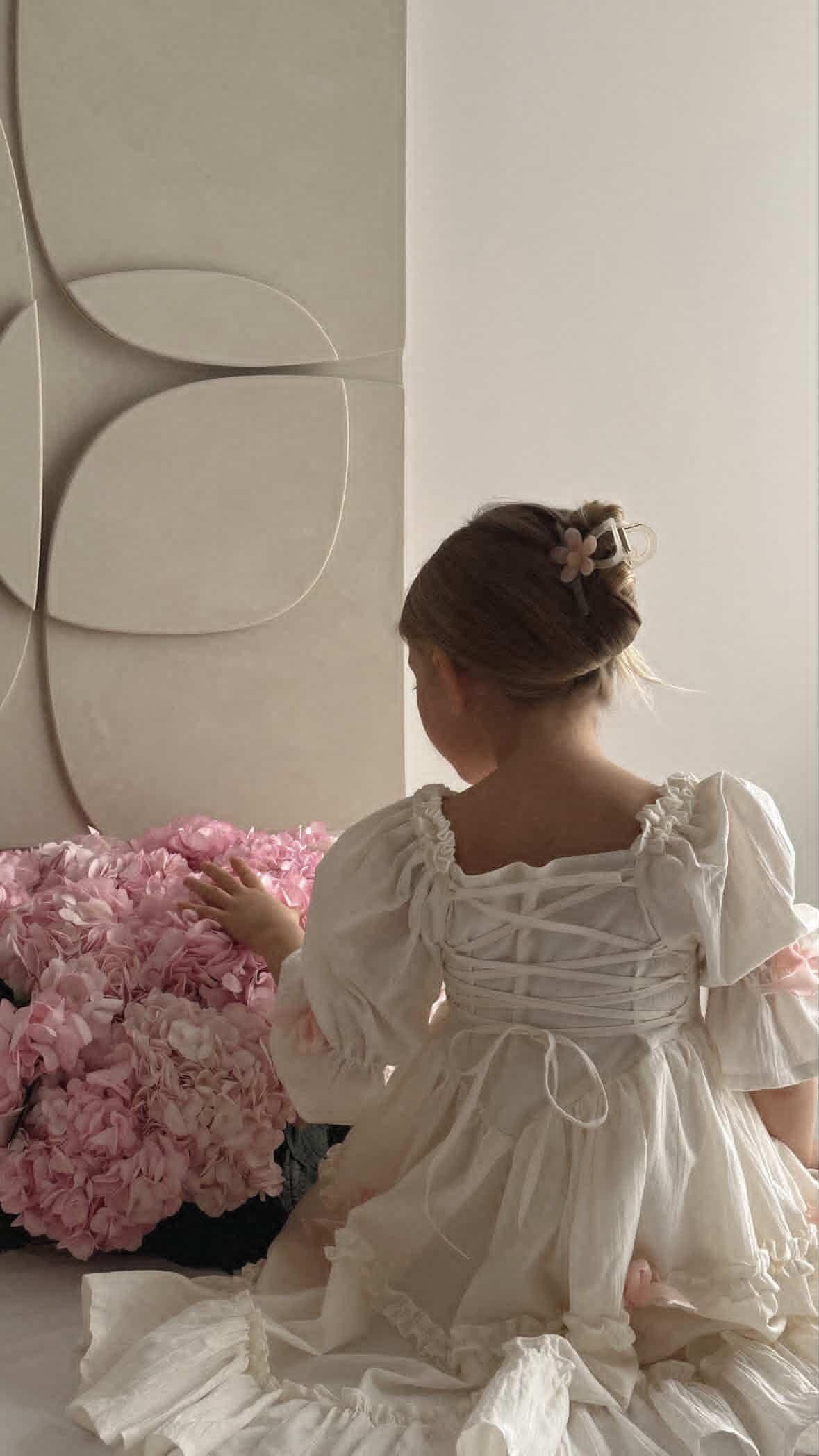 Платье выполнено из тонкого 100% хлопка крэш с подкладом. На спинке есть регулируемая шнуровка. Легкое, как взбитые сливки, нежные, как лепестки роз, и бантики — как глазурь на любимом пирожном. Розовые заколки с длинными лентами и бант в комплекте. В наличии 2 платья.