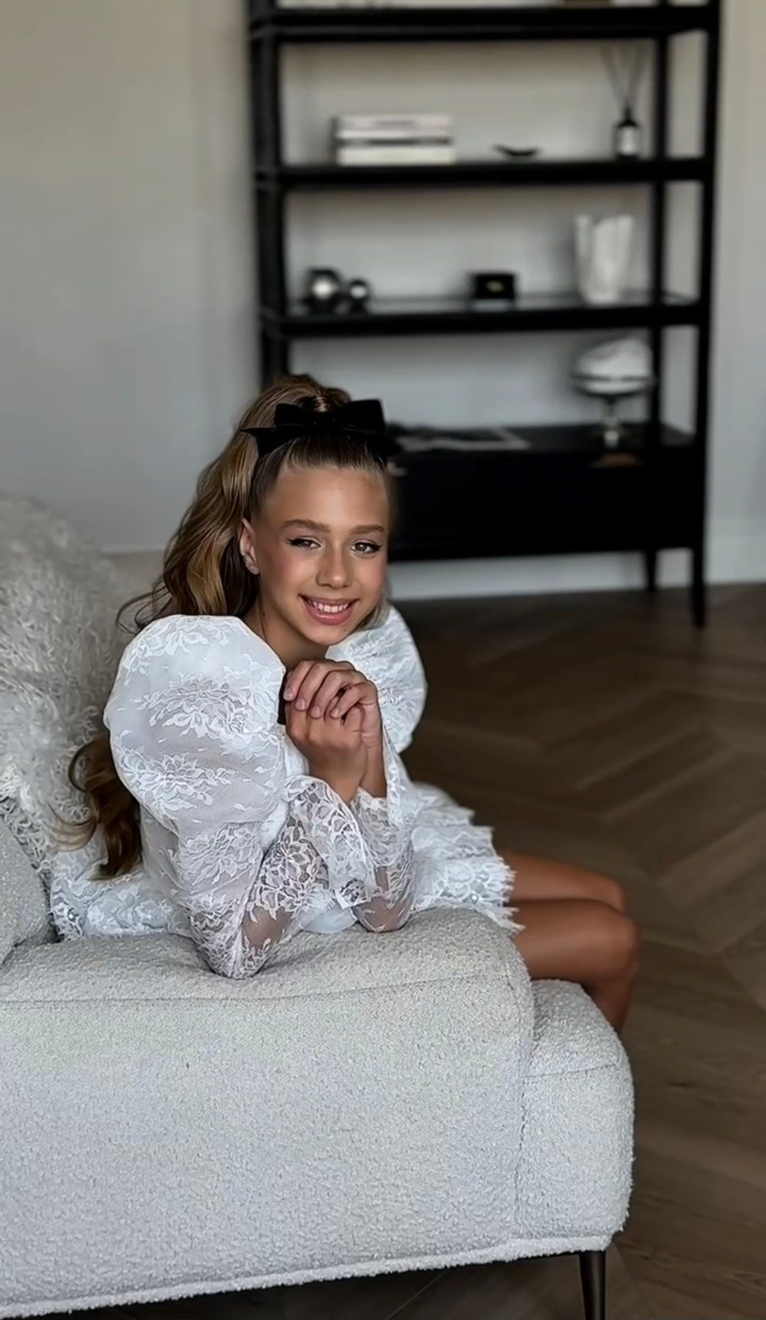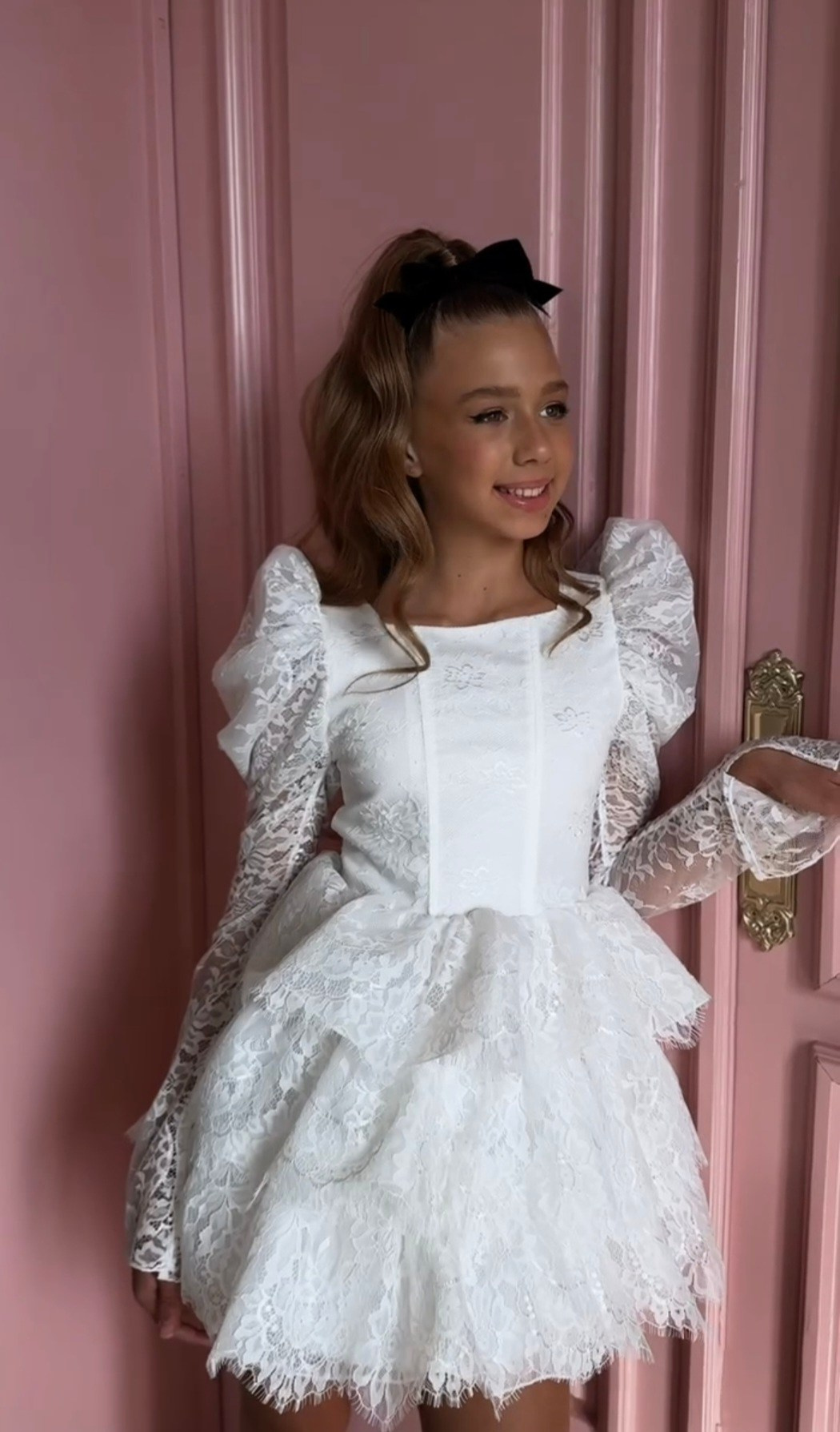 Расшитое кружево, пышные клинья, нежная шнуровка спереди и легкий шлейф. Большие банты с длинными лентами в комплекте. В наличии 3 платья.