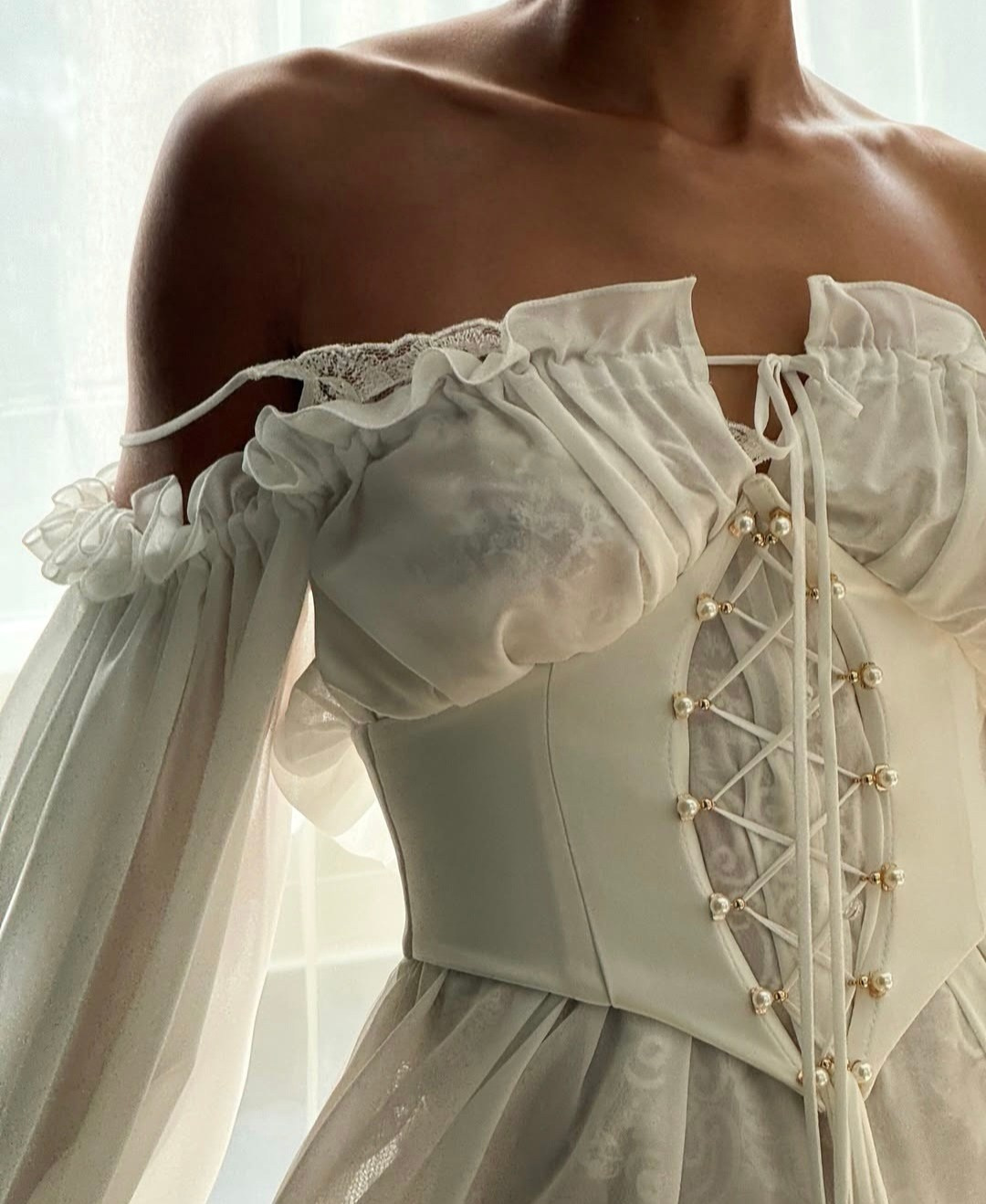 Комплект «тройка»: кружевная сорочка + воздушный шифон + корсаж для идеальной посадки платья по Вашей фигуре. Не просвечивает, однако надевайте только бежевое/телесное нижнее белье. В наличии одно платье